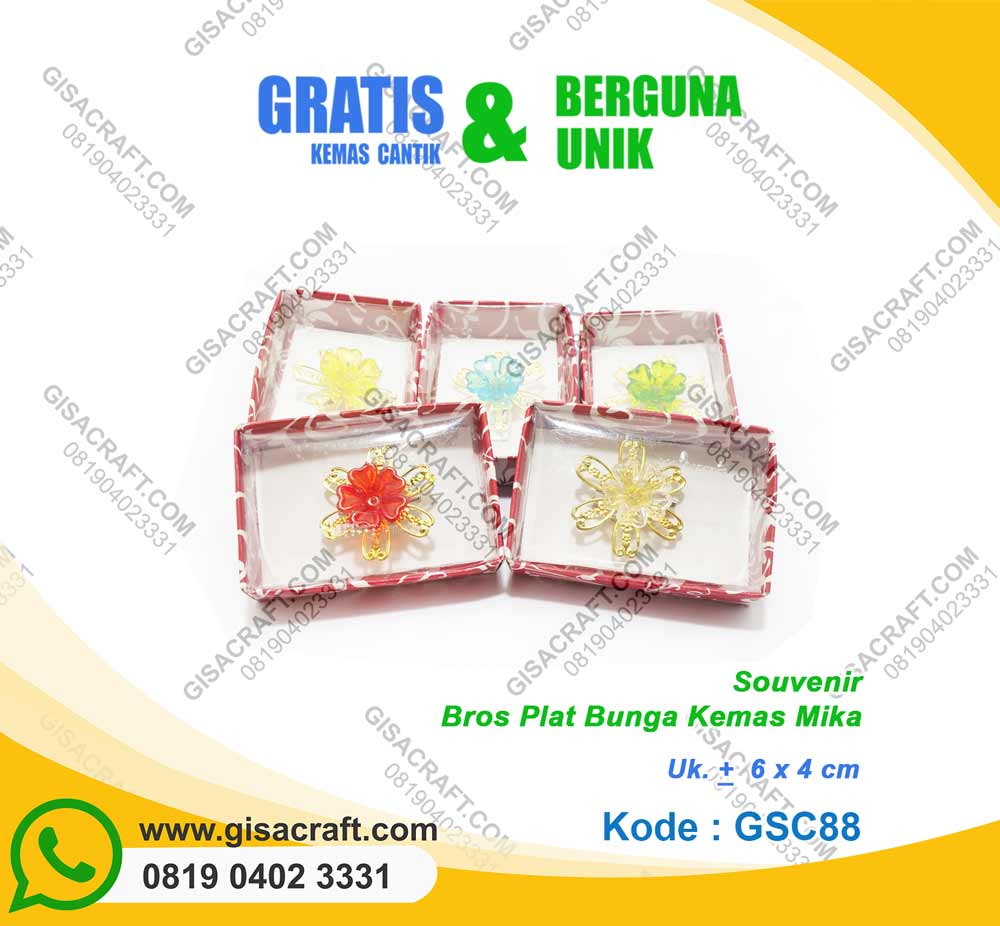 Berikut ini adalah produk bros kami yang bernama souvenir Bros Plat Bunga Kemas Mika GSC88 dengan deskripsi produk